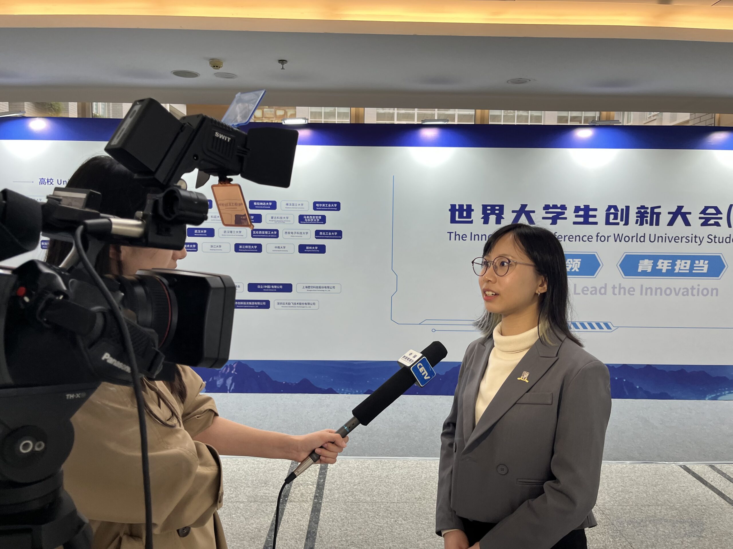 圖七: 伍穎曦博士在「世界大學生創新大會 (2025)」結束後,接受了中國教育電視台訪問 (照片來源: 知識轉移事務處)
