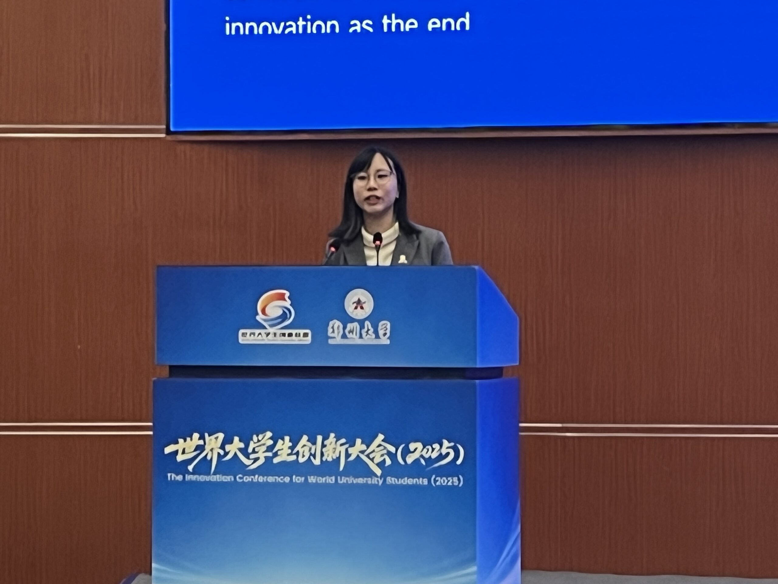 圖六:2025年港澳區域賽一等獎項目代表、中大伍穎曦博士於「世界大學生創新大會 (2025)」中發表演講 (照片來源: 知識轉移事務處)