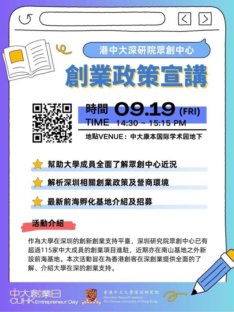 作為大學在深圳的創新創業支持平台,深圳研究院眾創中心已有超過115家中大成員的創業項目進駐,近期亦在南山基地之外新設前海基地。本次介紹,旨在幫助大學成員全面了解眾創中心近況,並進一步了解深圳相關創業政策及營商環境等。